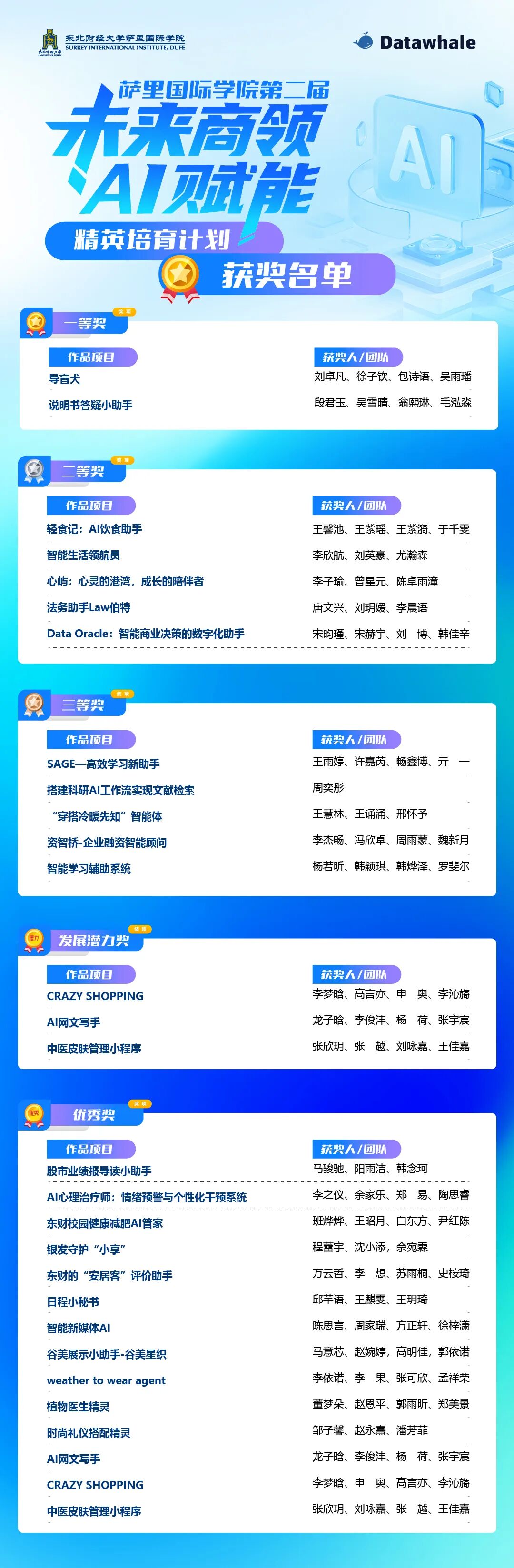 2025年12月2日,由萨里国际学院和国内头部的开源AI学习社区Datawhale联合举办的第二届“未来商领·AI赋能”精英培育计划决赛路演圆满落幕。
