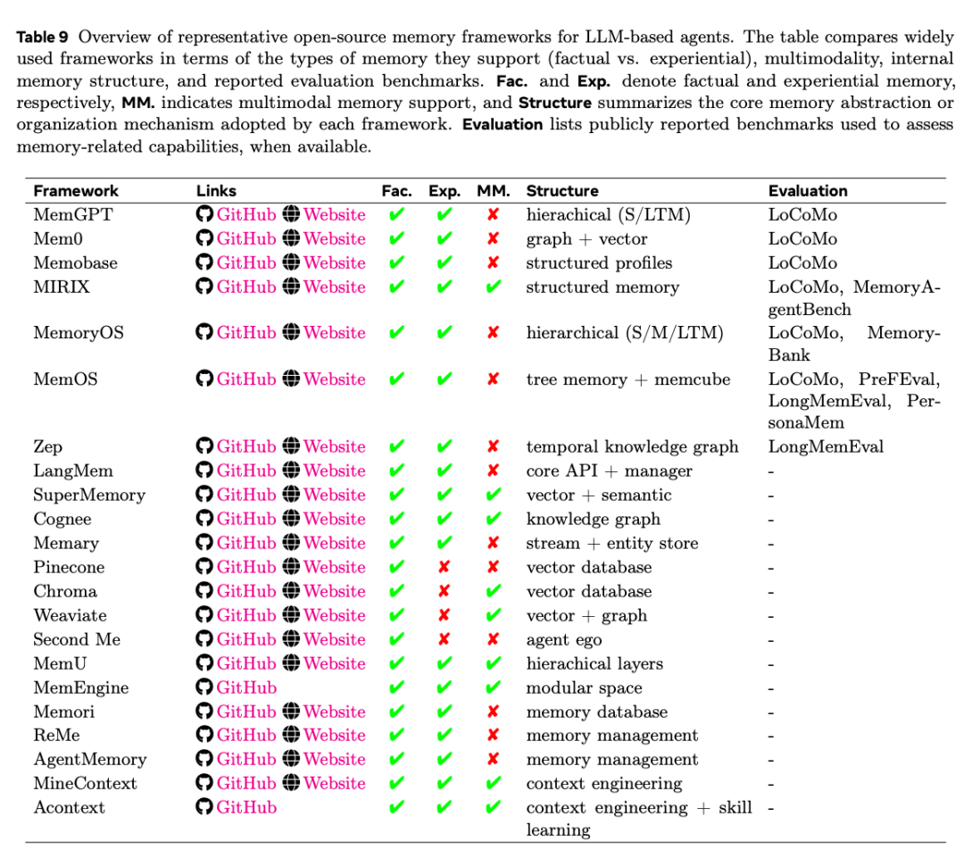 表 9 对比 20+ 开源框架(MemGPT / Mem0 / Zep / MemOS …):