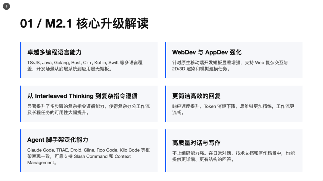 其实M2发布后,我们收到了很多反馈。大家会觉得M2在某些代码工具上表现不错,但在另一部分工具上表现得不够好。M2.1这次升级,核心逻辑是不再只讲“M2”,而是基于M2架构做了一次针对“真实开发任务”的全面能力跃迁。