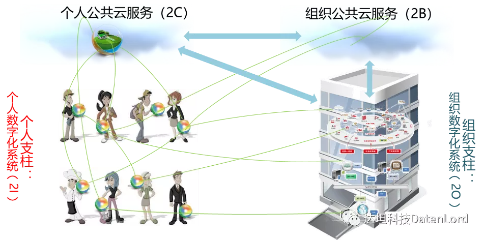 个人的数字化,并非是现在流行的“2C”,那些仅仅把个人作为一个消费者向其提供服务;个人数字化是真正把个人作为社会功能的基本主体,支撑个人工作与生活的方方面面的数字化系统,类似于企业组织需要ERP(企业资源计划系统)、OA(办公自动化系统)及PLM(产品生命周期管理)等等数字化系统支撑自己的正常高效运转。所以,个人数字化系统称为“2I(Individual)”更为准确。而组织的数字化系统,如ERP、OA及PLM等则相应为“2O(Organization)”。因此社会的数字化粗略地可以如图所示,包括了2C,2B,2O与2I四个主要的相互联系在一起的部分。