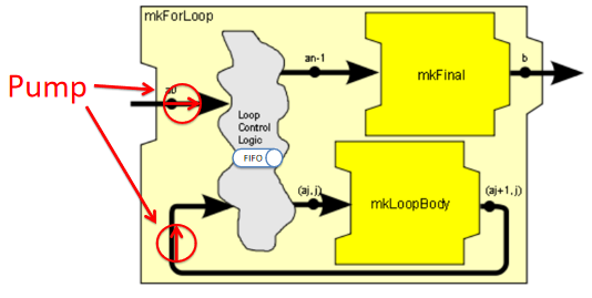 mkForLoop需要通过n_iters参数传入循环次数。在实现逻辑上,Loop Control Logic内部有一个共享队列,外部进入的新数据和经过循环体执行过一次处理的数据,都会被放到这个队列中。每个新进入的数据都会被打上一个Tag,Tag的值为循环次数,这个Tag伴随着数据在循环中流动,每流动一次,Tag减一,Loop Control Logic在从共享队列中取出数据时,会根据Tag的计数值决定将其送入mkLoopBody节点还是mkFinal节点。内部有两条Rule,分别独立负责把新数据和正在循环的数据放入FIFO中,为循环提供了内在动力(图中Pump标注路径)。