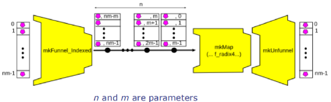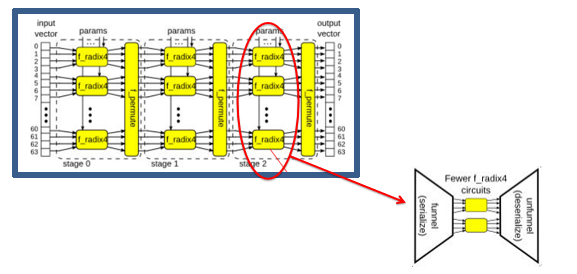 如上述代码片段和图20所示,通过mkMap_fn_with_funnel_indexed函数的第一个参数来决定实例化多少个f_radix4计算单元,从而改变计算的并行度。