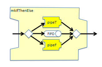 mkIfThenElse可以实现分支逻辑。输入数据是一个Tuple2#(a, Bool)类型,该节点会根据Bool类型的取值将数据包路由到pipeT或者pipeF子节点。其内部具有一个FIFO结构用于存储Token,从而实现在pipeT和pipeF两个节点所需处理周期不一致时起到保序的作用。