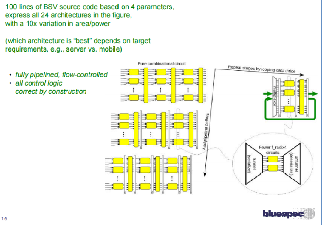 在最终效果部分,直接引用Bluespec原始介绍PPT[2]中的一个页面来进行说明,使用不超过100行代码,仅需要调整4个参数,即可实现在24种不同的计算架构之间进行切换,这24中计算架构在面积和功耗上的差异可以达到10倍以上,用户可以根据自己的使用场景灵活的选择实现方案。