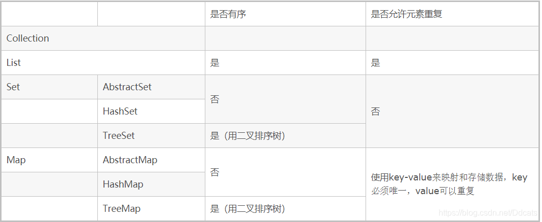 1.collection是集合的根接口,中间包含set和list两个;set:不可以存在重复值,无序. list:可以存在重复值且有序。(Map是集合的另外的一个接口,和collection无关,但是也是集合,形式为<key,value>键值对形式,其中:key不可以重复,value可以重复,需要利用key来查询map集合中value的值)。