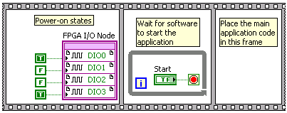 必须对FPGA VI进行编程,以便程序框图无需依赖主控VI便可设置输出状态。例如,可在顺序结构的第一个帧内放置数字和模拟输出函数。然后将余下的LabVIEW代码放在顺序结构的后续帧内,如以下程序框图中所示。然后配置FPGA VI在其被载入FPGA后立即执行。编译FPGA VI并将其下载至FPGA终端的闪存,然后配置FPGA终端在FPGA终端上电时,自动从闪存载入FPGA VI。FPGA终端上电后,FPGA VI将从闪存载入到FPGA,然后立即开始执行。FPGA VI顺序结构的第一个帧内的输出函数将设置上电输出状态。