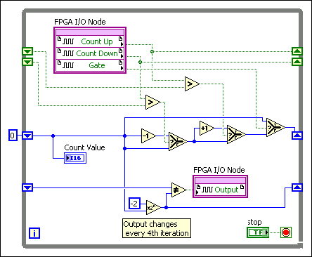 FPGA I/O函数可创建更高级的计数器。例如,应用可能需要带有独立向上计数(count up)、向下计数(count down)及门输入和输出(gate inputs and output)的计数器,如以下程序框图所示。
