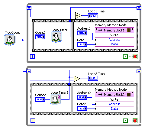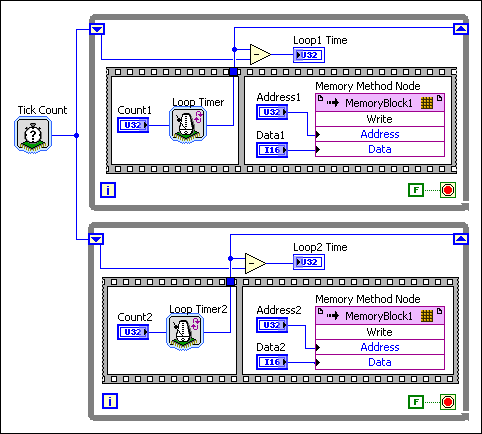 对单个资源的访问方数量越多,产生抖动的可能性越大。但如果能避免同时发出请求,无论潜在的访问方数量多少,判定器的延时均为常量。为避免上述范例中的多个访问方,可创建另一个存储器项(MemoryBlock2)并写入至底层While循环,如下列程序框图所示。
