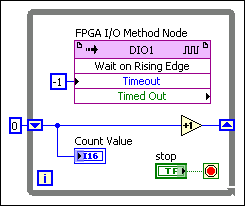在While循环中使用FPGA I/O方法节点函数可创建简单事件计数器。例如,可使用等待上升沿方法等待数字输入接线端出现上升沿,如以下程序框图所示。