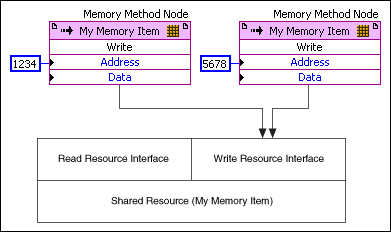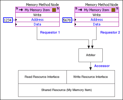 但在下列示意图中,两个存储器方法节点请求通过同一个资源接口访问同一个共享资源(我的存储器项)。如两个存储器方法节点同时请求访问共享资源将产生资源冲突。