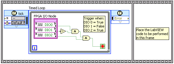 在单周期定时循环(single-cycle Timed Loop)内可放置配置了数字输入资源的FPGA I/O节点,且仅当数字输入满足触发器模式时退出单周期定时循环。在顺序结构的第一个帧内放置单周期定时循环。这个操作与上个范例中对等待上升沿方法的等待操作类似。