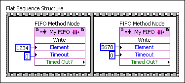 如果您为资源接口选择从不仲裁选项,则LabVIEW不会添加仲裁组件,显著节约了FPGA资源。除了节省资源,从不仲裁选项还使一些FPGA I/O和FIFO函数可在单时钟周期内执行。但对于多个请求方的情况,多个信号将被合并为一个信号,从而导致产生额外的逻辑占用。要使用从不仲裁选项,您必须保证按顺序访问FPGA VI数据流中的资源接口,如下图所示。