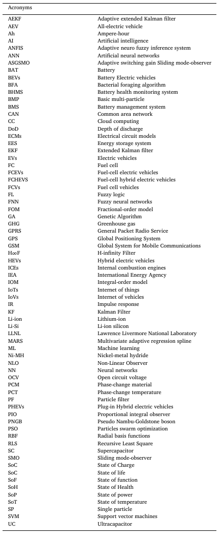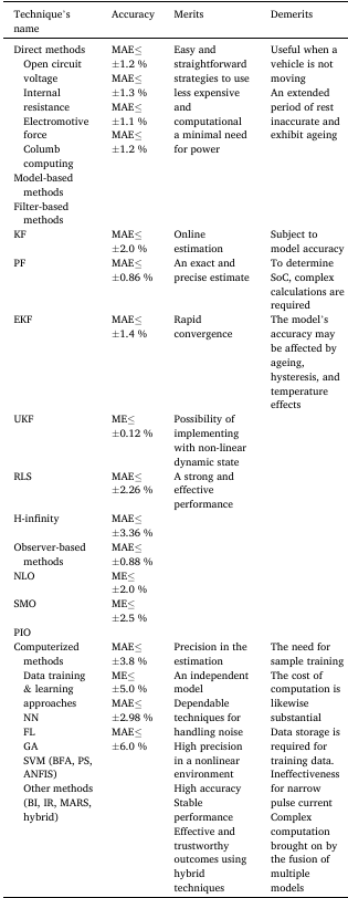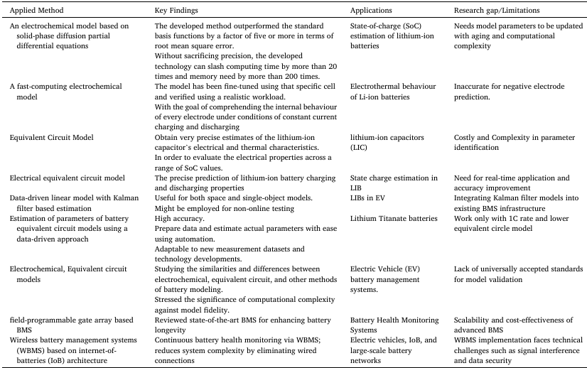 提高电池存储系统的效率对于电动汽车实现其最大潜力和解决与低能量密度电池技术相关的挑战至关重要。这种优化采用了一种综合方法,包括精确电池模型的建模、最佳状态估计技术和先进的电池健康监测系统(BHMS)技术。为了最大化电池组的使用寿命和性能,必须采用精确的方法来评估内部电池单元的当前状态。电动汽车的耐用性、安全性和可靠性都取决于这一因素。电池管理系统(BMS)的实时监测技术是电动汽车(EVs)能量存储优化的关键因素。电池模型、单元配置、热管理策略和包装决策对系统的整体性能有显著影响。表1总结了与电池状态估计和建模相关的各种技术的文献回顾和研究空白。