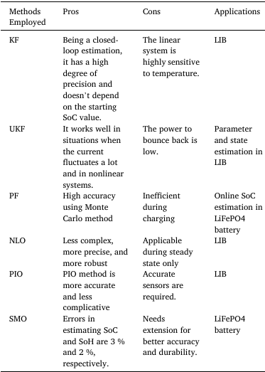 表10列出了各种先进方法在电池状态估计和建模中的优缺点。