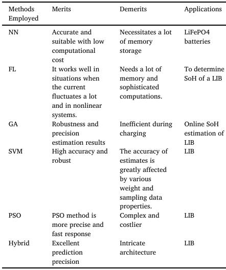 - 另一种有效的技术用于确定非常复杂和非线性排列(如锂离子电池)中未识别的约束,即模糊逻辑(fuzzy logic,FL),根据阿里等人的研究。由于FL仅使用输入数据,并通过模糊规则库来确定约束,因此不需要对系统有详细的科学原型。推理引擎、模糊规则基础、去模糊化和模糊性是可以分开描述FL操作的四个阶段。尽管FL在预测非线性模型方面具有强大的功能,但根据埃斯佩达尔等人的研究,它也需要昂贵的处理单元、大量内存和复杂的计算。