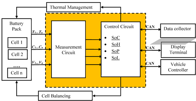 在电动汽车中,可充电电池组的性能由电池管理系统(BHMS)进行管理。当电池充电和放电时,它会监控并控制内部操作变量,如温度、电压和电流。BHMS 进行计算以确定电池的充电状态(SoC)和健康状态(SoH),从而优化其性能。它可以防止电池组过充或过放电。为了避免意外事件(如爆炸),它保持充电水平在最大和最小允许水平之间。因此,BHMS 是确保电池和用户安全的绝对必要工具。在发现操作参数(电压、温度等)存在问题后,BHMS 会启动报警系统,并将电池组从负载或充电器中拔出。在电动汽车中,BHMS 负责监控、管理、优化以及提供对电池执行相关重大风险的保护保险。电动汽车中的各种 BHMS 组件—传感器、开关、调节器等—由一系列规则、模拟和信号来管理。BMS 的一般功能布局如图 4 所示。