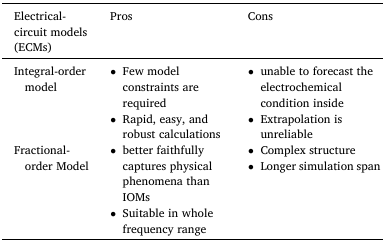 电路模型的优缺点在表3中进行了说明。陈等人利用分数阶模型对锂离子电池的充电状态进行了估计,如公式(4)