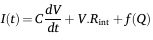 其中,I(t) 是电流,C 是电池容量,V 是电压,Rint 是内阻,f(Q) 是电荷 Q 的一个函数。锂离子电池(LIB)的等效电化学模型如图所示。