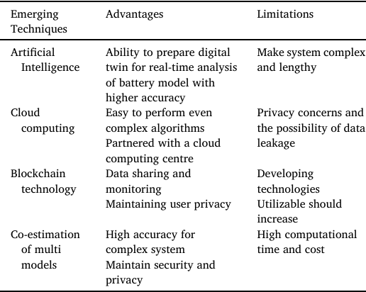 传感器技术的广泛应用以及物联网 (IoT) 设备的持续进展,使得收集大量数据变得更加容易,并允许对电池数字形式进行更深入的探索。根据 Xi 等人的研究,许多数据驱动的人工智能技术,如机器学习 (ML)、支持向量机 (SVM)、径向基函数 (RBF) 以及神经网络 (NN),正获得重新关注。通过融合人工智能和电池管理系统 (BMS),可能会创建一个电池信息双胞胎,这将为更准确地评估各种电池状态提供一个智能、精确和有效的框架。有一些研究项目已经取得了成功的结果。使用人工神经网络模型预测了锂离子电池 (LIB) 的温度。此外,为了有效调节电池的状态电量 (SoC),Som 等人使用了微调的进化算法和增强的碰撞体优化。深度神经网络结构可以有效地用于电池状态估计。未来的电池管理系统将极大受益于这些基于人工智能的解决方案。