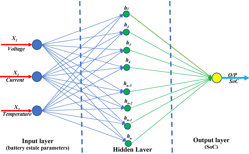 - 一种称为神经网络(NN)的计算框架主要基于人脑的结构设计,用于执行一系列功能。自适应和学习的能力使NN能够构建极其复杂的非线性系统。它采用了三层结构,输入层和输出层中的神经元满足系统需求。图8展示了由于神经元和隐藏层的作用,输入层与输出层之间的联系。NN利用SoC作为输出,流电流、站电压和温度作为输入来构建NN网络的拓扑。然而,算法必须保留大量数据以进行训练,这不仅给机器带来了负担,还需要大量的内存存储。EKF、UKF、BFA等技术与NN相结合,以提高其效率和性能。
