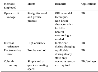 多个研究项目专注于直接估计电池状态的方法。开路电压(Open circuit voltage,OCV)是一种离线技术,专注于根据王等人的研究在提供的表格中找到最相关的信息。电池的荷电状态(SoC)与开路电压(OCV)之间的关系通常是线性的(成比例的)。然而,并非所有类型的电池在SoC和OCV之间都有精确的1:1比率。电池的材料和能力会影响这种关联性。例如,铅酸电池在OCV和SoC之间具有线性关系,而锂离子电池则没有。这个过程简单而精确。然而,OCV技术的基本缺点是,它需要较长的休息时间以达到平衡。此外,由于电池的滞后特性,充电时可能导致高OCV,而放电时导致低OCV,需要仔细监测充电和放电电位。