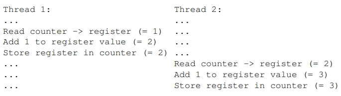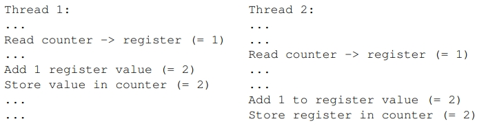当多个线程访问共享数据时,通常会出现竞争条件,并且结果依赖于指令交错的顺序。