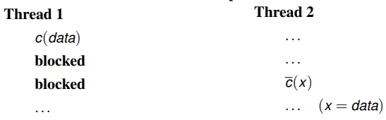 c(data)想 发送 数据,但 Thread 2 尚未准备好接收,于是 Thread 1 阻塞。 -