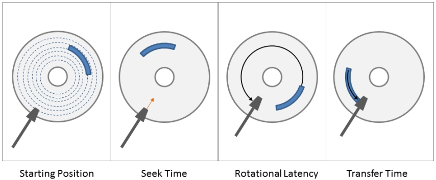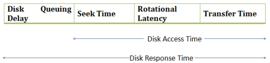 访问时间=寻道时间+旋转延迟+传输时间(Access time = seek time + rotational delay + transfer time)