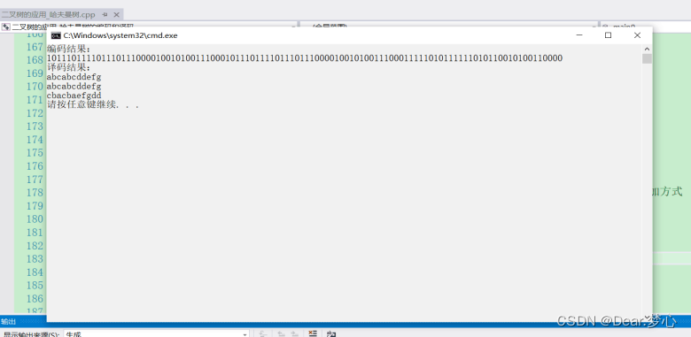 译码也不难,根据根节点和编码的步骤一步步往下走,当找到了叶子节点就输出返回到根节点,要注意的是这种输出方式是输出的节点后必须有操作,而最后一个节点不满足此条件,那么只需将其单独拿出来输出就ok,同时译码也将结果存入定义好的文件中。