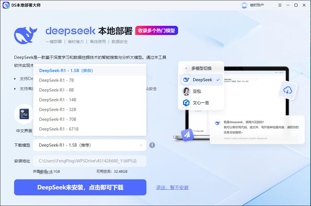 ①首先,下载DS本地部署大师软件并安装,随后,打开软件,选择下载模型(DeepSeek -R1-1.5B)。