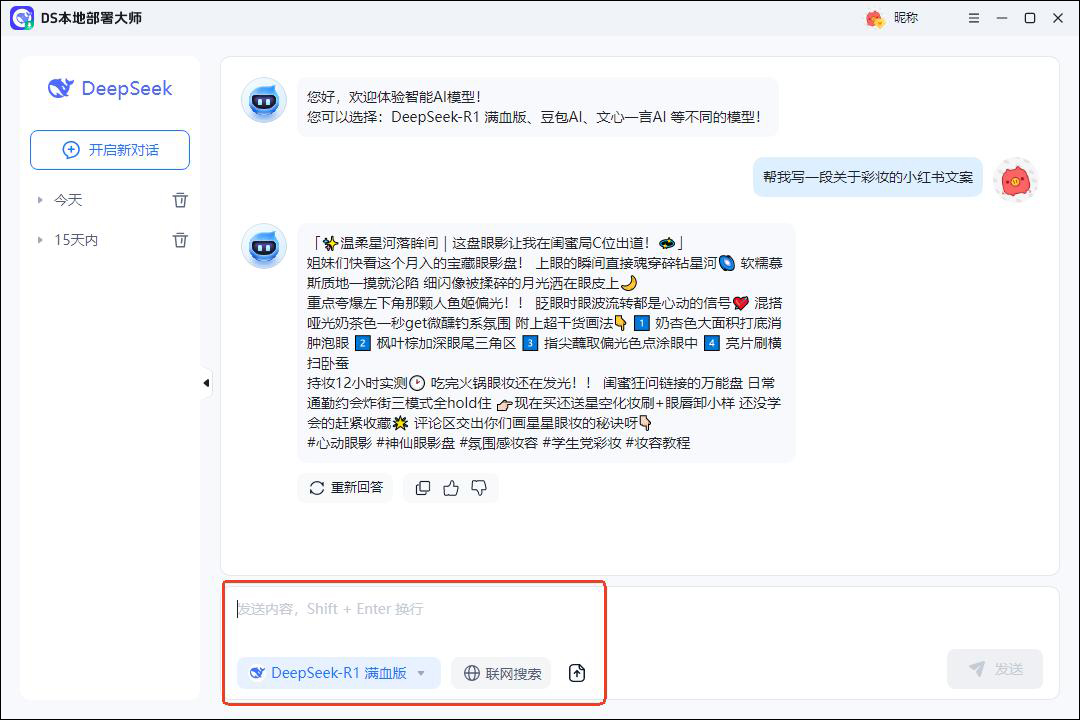 ③这时候,就可以直接在软件里启动 deepseek,开始使用啦!输入内容需求即可一键获取。