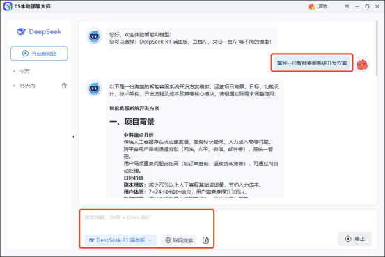 ④启动部署后,在新界面可选择智能问答模型,软件支持豆包、文心一言、DeepSeekden等模型,随后,输入生成要求即可一键生成内容啦!