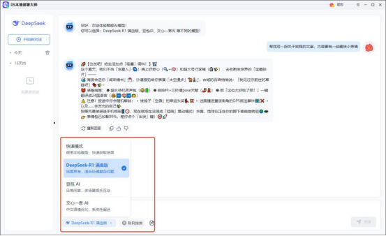一切准备就绪后,我们就能直接在软件中选择模型,如deepSeek、豆包等,选择其中一种,开始智能提问,如帮我生成文案等,等待软件生成备用。