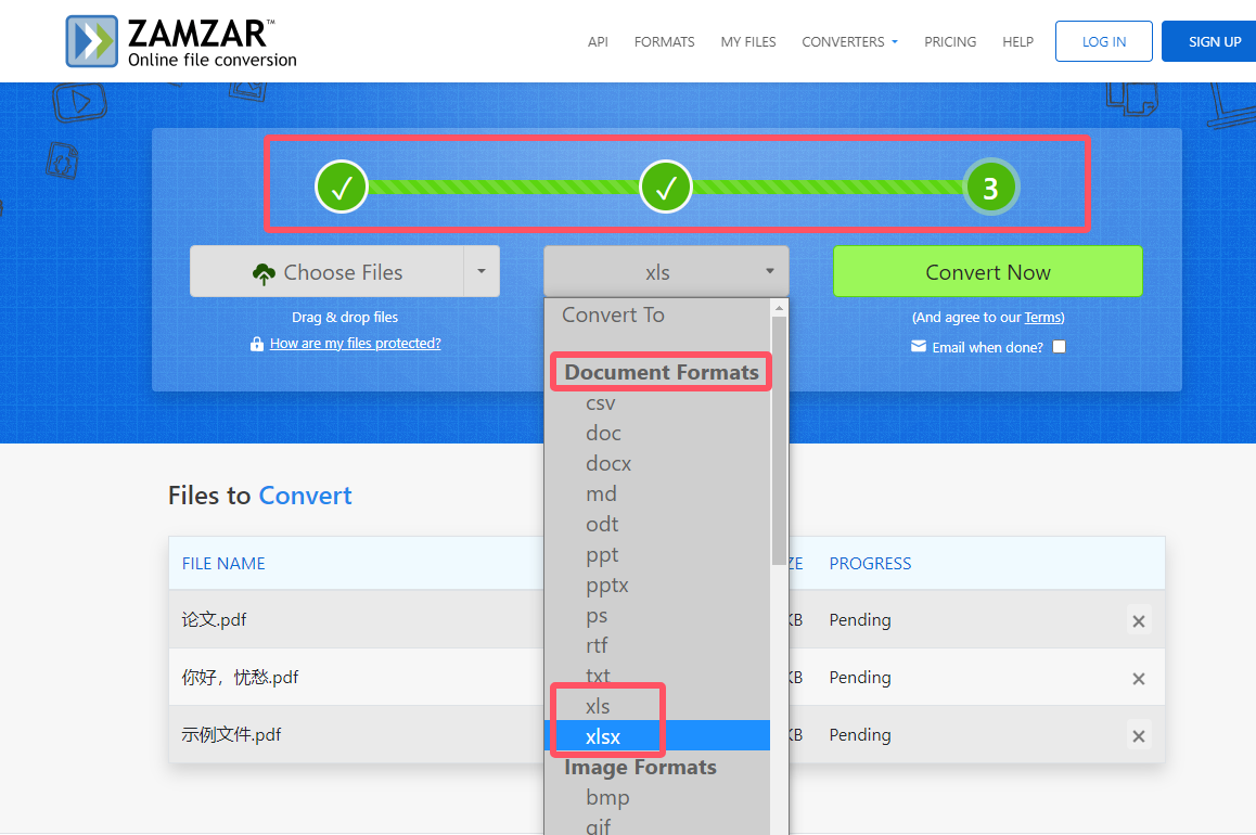 一个纯英文界面显示的在线文件转换平台,支持文档、视频、图片、电子书等多种类型,且操作仅需3步。先点击“Choose Files”导入文件,支持批量添加,接着在“Convert To”菜单栏下选择xls或xlsx,最后按下“Convert Now”,等完成后下载查看结果。