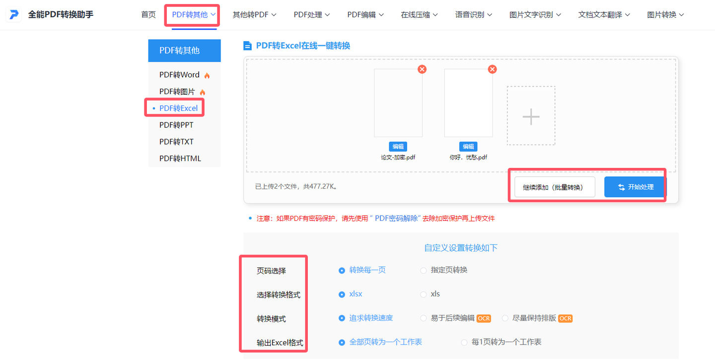 集PDF转换、PDF处理、PDF编辑等众多实用功能于一体的在线平台,无需注册登录就能直接用。先找到“PDF转其他”栏下【PDF转Excel】进行单或多个文件上传,接着自主选择页码、转换格式、转换模式和输出Excel格式,最后按下“开始处理”,完成即可下载保存了。