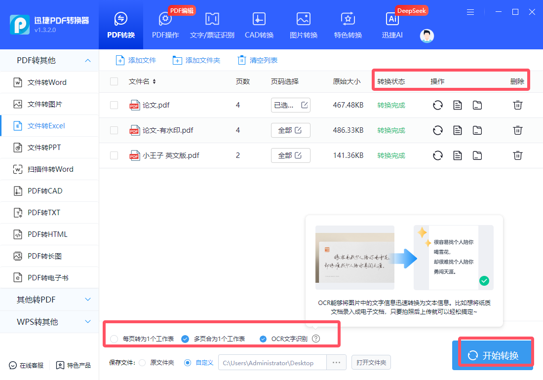 可将每页转为1个工作表或将多页合成1个工作表,OCR文字识别也能按需选择是否开启,有助于将图片中的文字信息迅速转换为文本信息,最后按下“开始转换”,稍等片刻便可查看结果了。