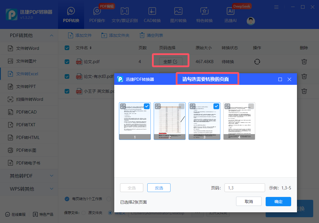 会清晰展示每个文件的名称、页数和原始大小信息,且默认转换全部页码,也支持自主勾选需要转换的页面,按下“确定”键返回主界面,并同步显示在“页面选择”栏下。