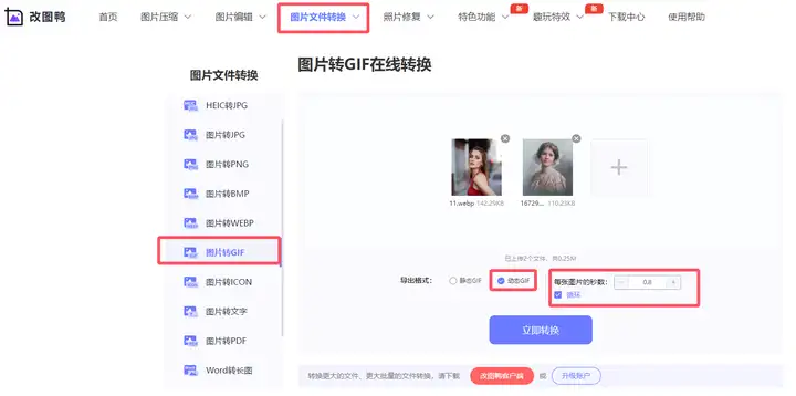 同名网站也能实现WebP转GIF这一操作,搜索打开后先选中“图片格式互转”栏下的【图片格式转换】工具,随后选择单或多个目标图片添加,除WebP外还支持PNG、JPG、BMP等格式,再将转换格式设定为GIF,稍等片刻即可下载导出。