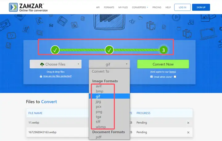 先点击“Choose Files”导入单或多张图片,接着在“Convert To”窗口的“Image Formats”类别里选择“gif”,最后按下“Convert Now”,完成后下载查看。