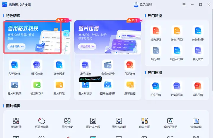 一款兼具专业性与易用性的图片转换软件,包括但不限于格式转换、图片压缩、图片编辑、抠图拼图、照片修复、智能证件照等多种功能,让图片处理事半功倍!