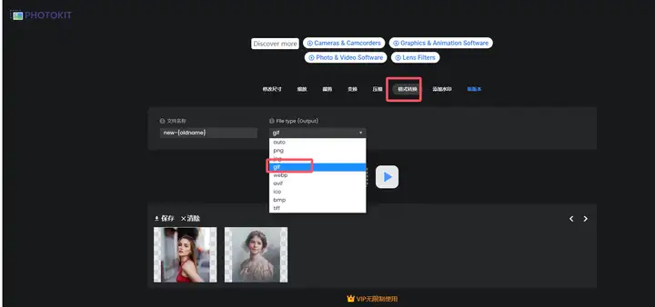 打开后先点击右上角的“批量处理”,接着在【格式转换】界面上传图片,可一次选多张,再将输出文件类型选为gif,等完成后还能进行保存、复原等处理。