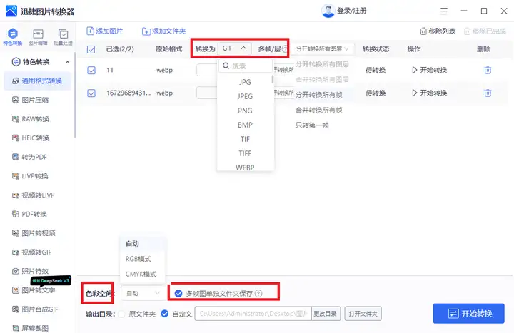 默认统一转换为JPG,需将其调整为所需的“GIF”,多帧/层和色彩空间也支持选择设置,还可勾选多帧图单独文件夹保存,速度很快,完成后便可打开查看了。