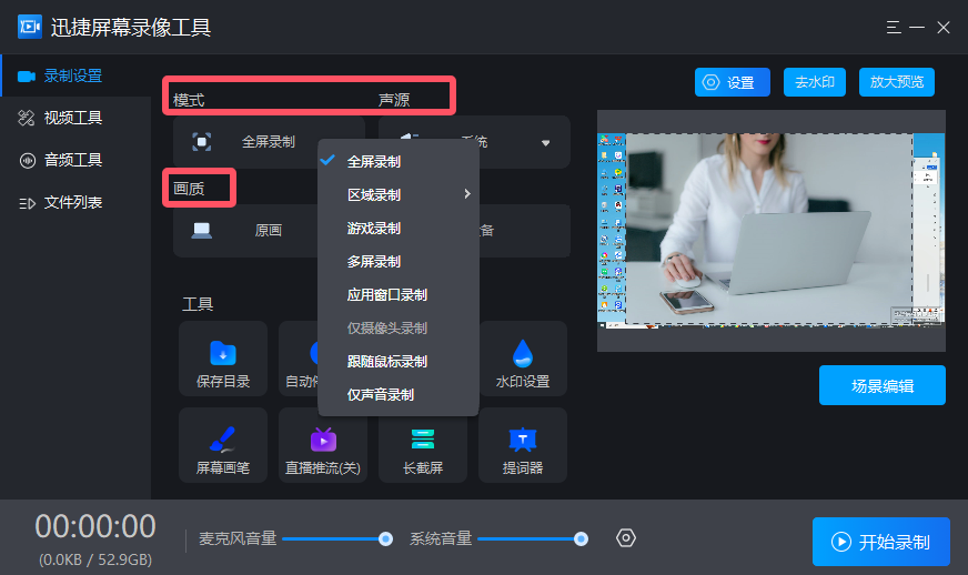 • 按照自身需求选择录制模式,再一并设置声源、画质和摄像头