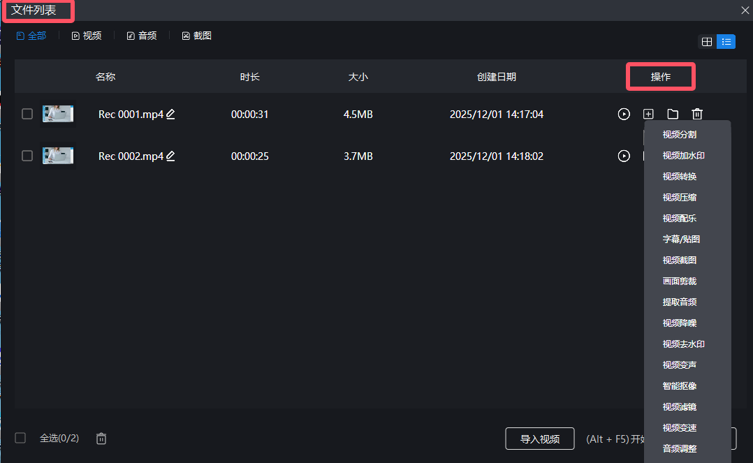 • 结束录制后会将视频自动保存至“文件列表”,还支持播放、删除、转换等一系列后续操作。