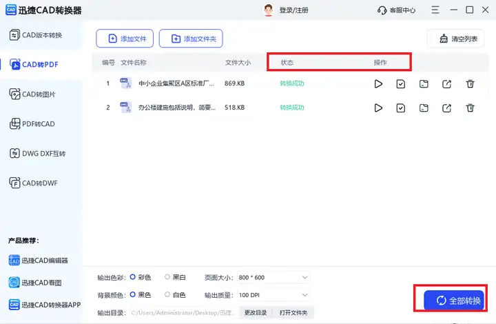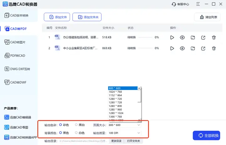 打开后直接点击【CAD转PDF】,随后添加单或多个目标文件,会一并显示其名称和大小信息,再按需对输出色彩、页面大小、背景颜色和输出质量进行设置。