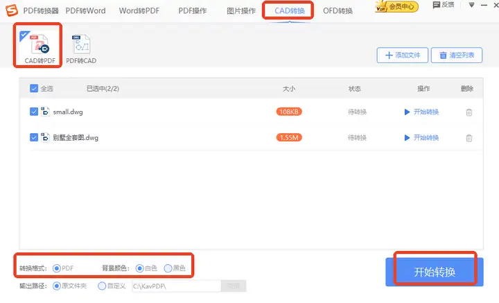 点击进入后在“CAD转换”界面选中【CAD转PDF】,随后添加文件,一次能选多个,转换格式即为所需的PDF,背景颜色有分白或黑,开通会员便可完成转换。