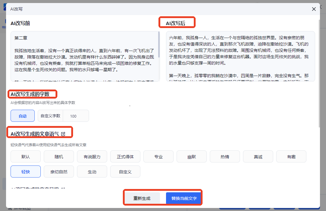 除了翻译、复制和导出这3大常用功能外还提供AI改写服务,会根据选定的字数、语气、风格和语言来生成与之符合的内容,若不满意还能继续请求重新生成。