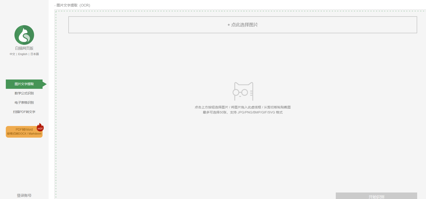 集图片文字提取、数学公式识别、电子表格识别和扫描PDF转文字这4大功能于一体的在线平台,显示语言除中文外还支持英语和日语,且无需注册登录就能用。