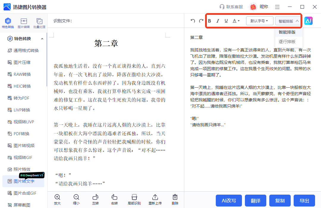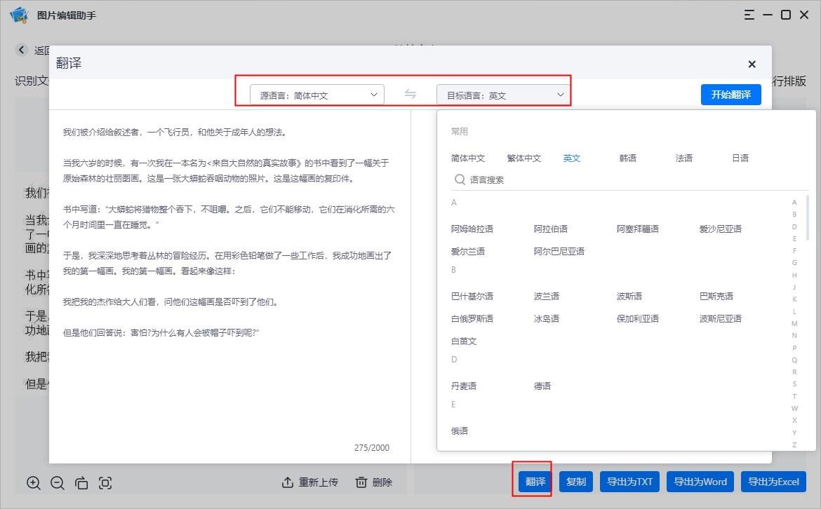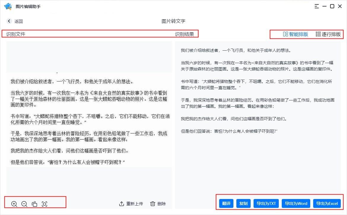 排版有提供智能和排版这两种可选,助力提升阅读体验,文字除支持一键复制外还可导出为TXT、Word和Excel,多语种翻译也不在话下,有效满足多场景需求。