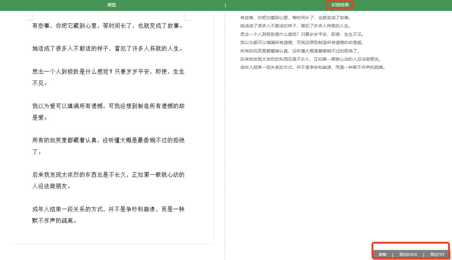 点击进入到【图片文字提取】界面后先选择图片导入,支持多种格式且一次能选50张,待识别完成便可查看结果了,复制、导出为DOCX/TXT和重新识别也OK。